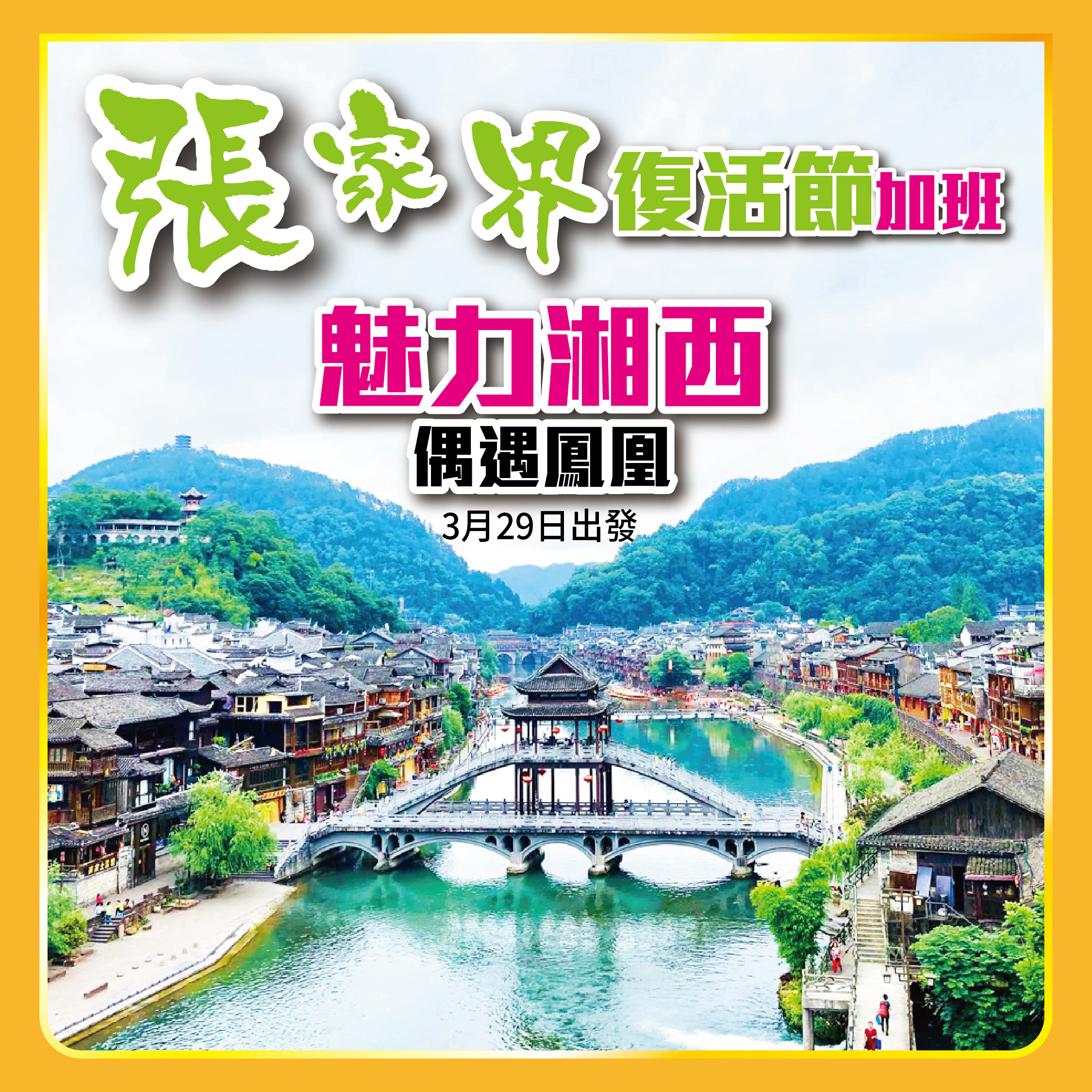 29/3 張家界復活節加班,無需請假4天;高鐵直达張家界,鳯凰高鐵回,節省最少8小时車程;重本包魅力湘西show;重本安排當地土家族風情晚宴;重本包張家界大景區門票;2024-03-04