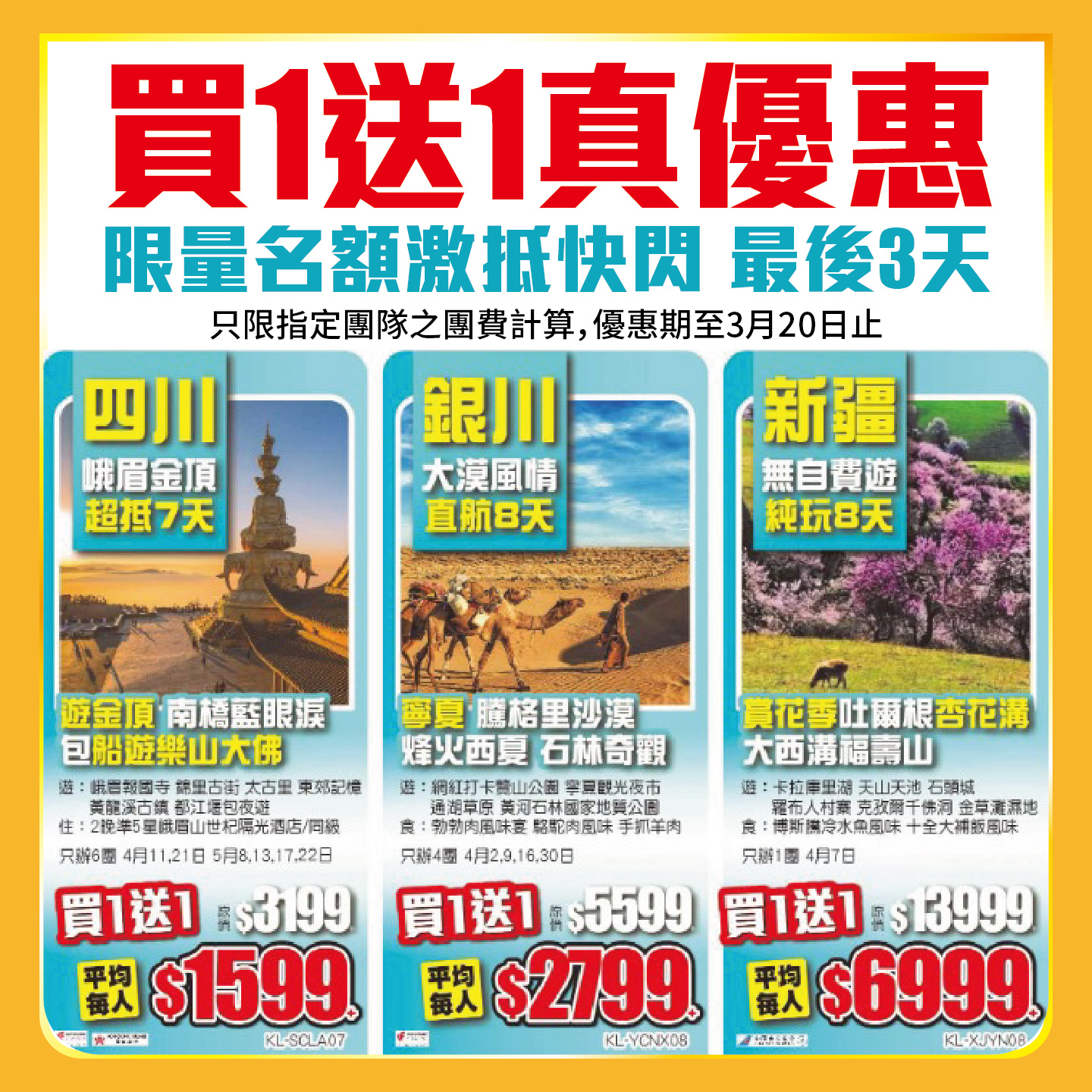 買1送1!週末快閃72小時!優惠至4月14日止!皇牌純玩系列+縱橫神州,大西北、東三省、西藏、新疆等目的地,暢遊中國大地;東南亞潮玩系列;2024-04-12