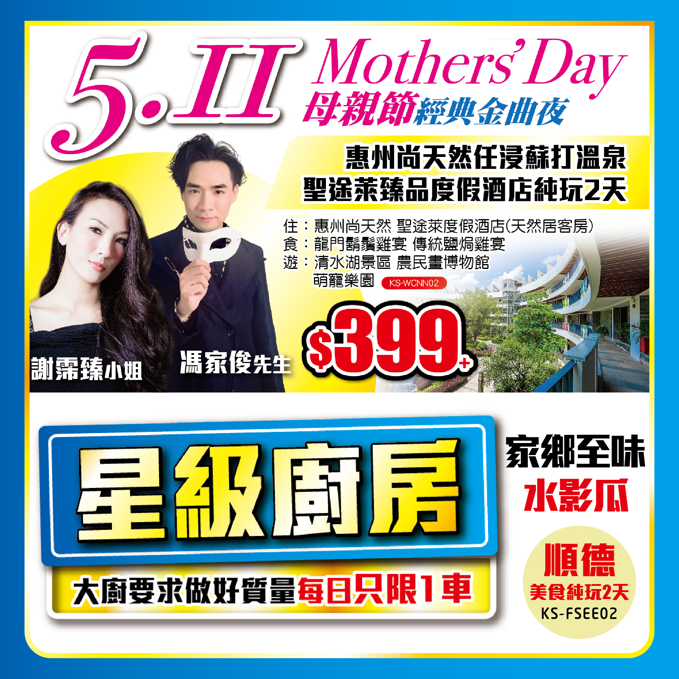 511 Mothers'Day 母親節經典金曲夜;星級廚房順德家鄉至味水影瓜;盤錦紅海灘直航純玩;精選峨眉山、普陀山、西安、北疆、茶卡鹽湖;2024-04-11