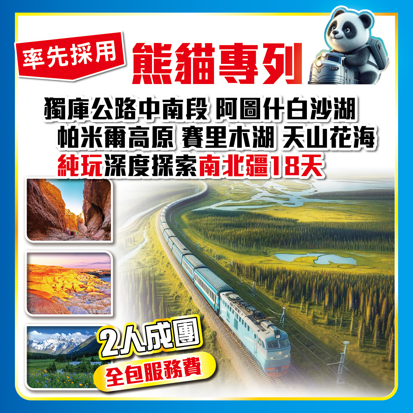率先採用熊貓專列,純玩深度探索南北疆18天,2人成團,全包服務費;東莞君濠大酒店歎酒店自助早午晚餐,送大容量子母行李包,1人1個帶回家;2024-04-18