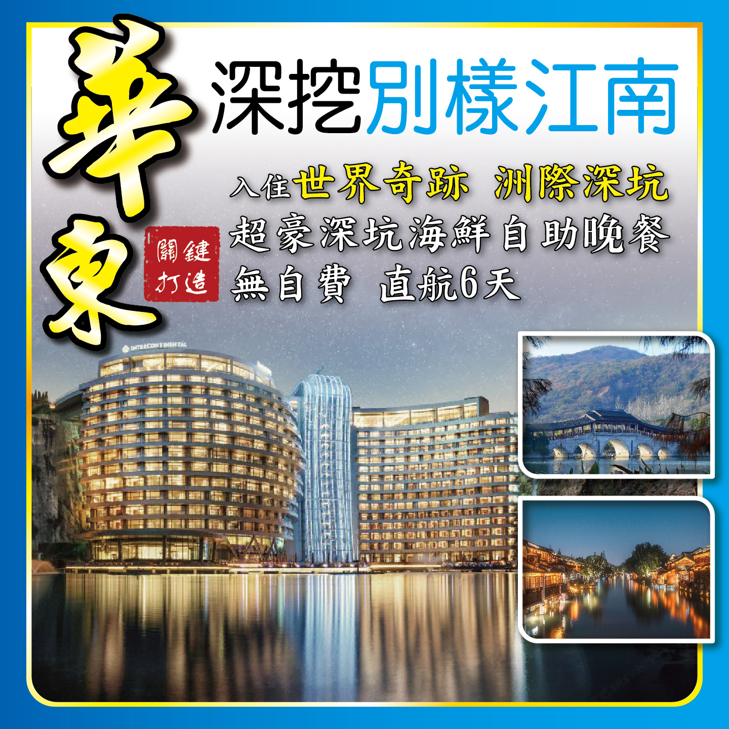 關鍵打造:華東深挖別樣江南,入住世界奇跡 洲際深坑酒店,超豪深坑海鮮自助晚餐,無自費,直航6天;船遊江南三大美景6天,包船遊西湖、南潯古鎮、黃浦江;2024-04-19