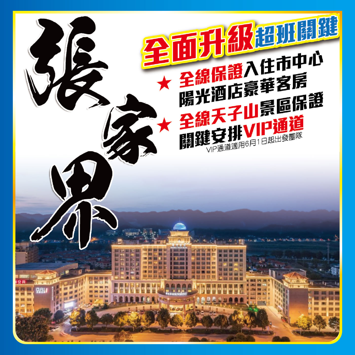 張家界 全面升級 班超關鍵 ★全線保證入住市中心陽光酒店豪華客房 ★全線天子山景區保證關鍵安排VIP通道(VIP通道適用6月1日起出發團隊);2024-04-24