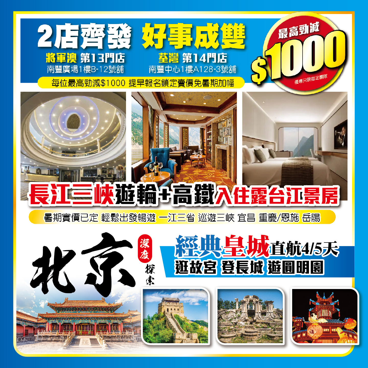 好事成雙,2店齊發!每位最高勁減$1000,提早報名,鎖定賣價免暑期加幅!長江三峽遊輪+高鐵,入住露台江景房,一江三省,領略長江壯闊美如畫;北京深度探索;2024-05-06
