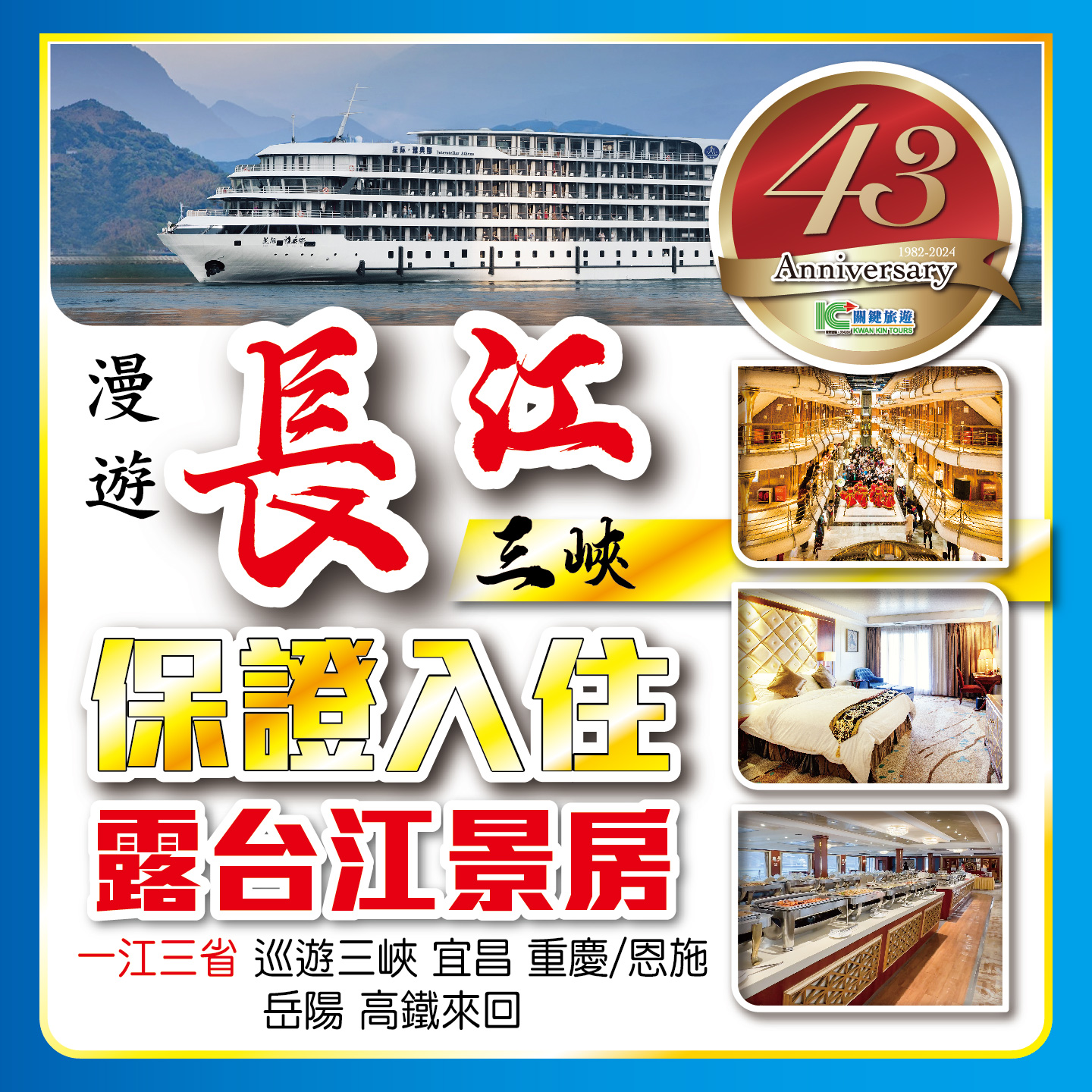 43週年(1982-2024)關鍵旅遊金鑽系列!豪華桂林、遊走長江三峽 6星星際阿波羅 保證入住 3樓以上露台房 包嚐11餐;2024-05-24