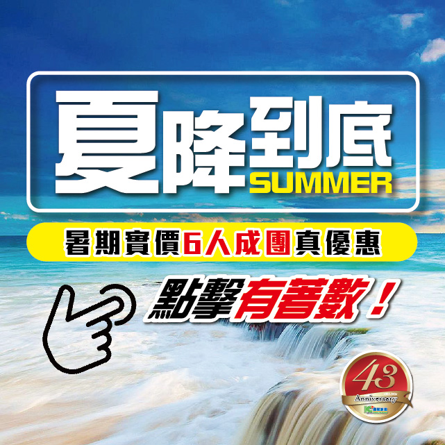 夏降到底(summer)7-8月早報名盡顯優惠!1)保證6人成團 輕鬆出發! 2)保證全線一口價! 3)早報名不設暑期加幅!2024-06-18
