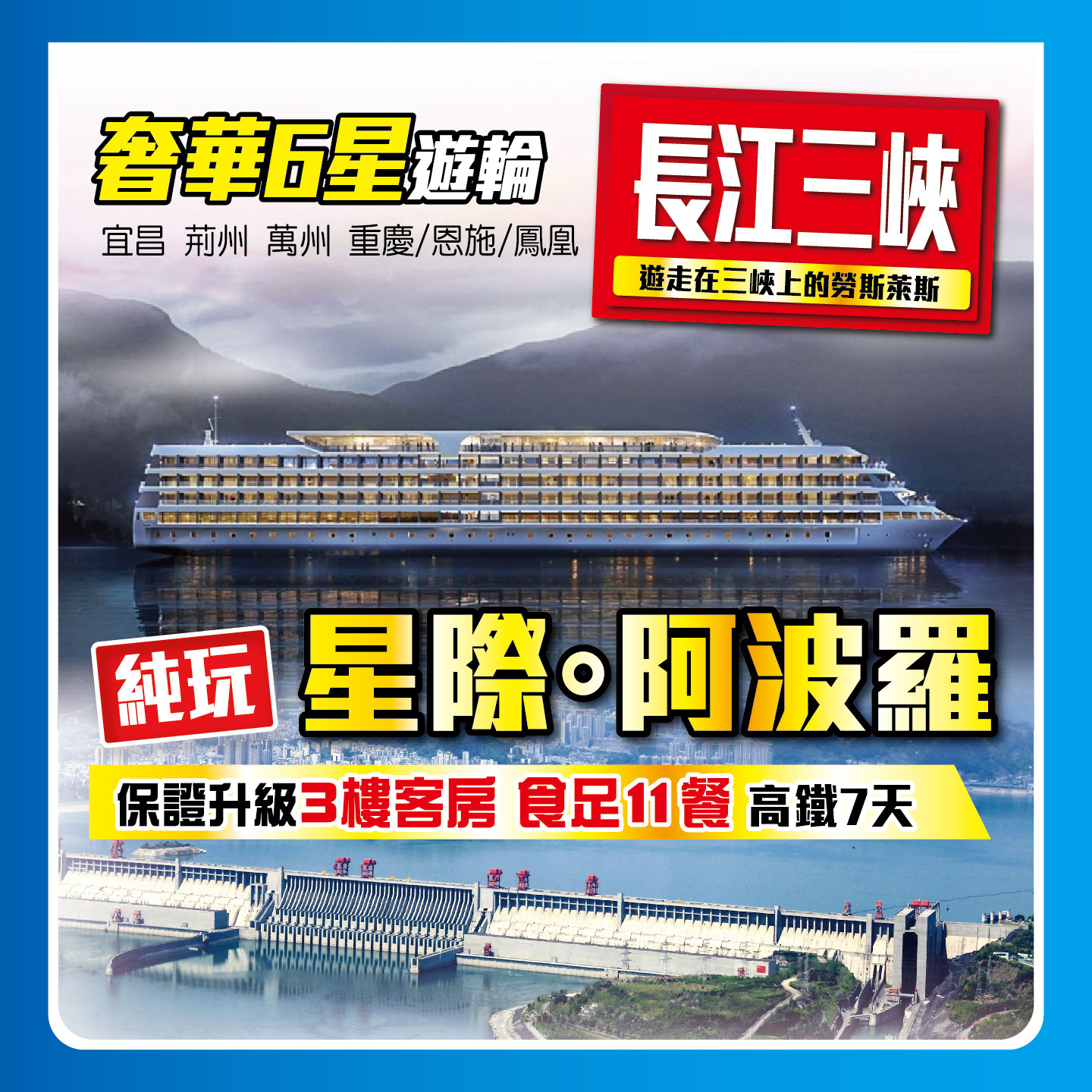 長江三峽 遊走在三峽上的勞斯萊斯-奢華6星遊輪-星際阿波羅-保證升級3樓客房 食足11餐-純玩高鐵7天;2024-08-09