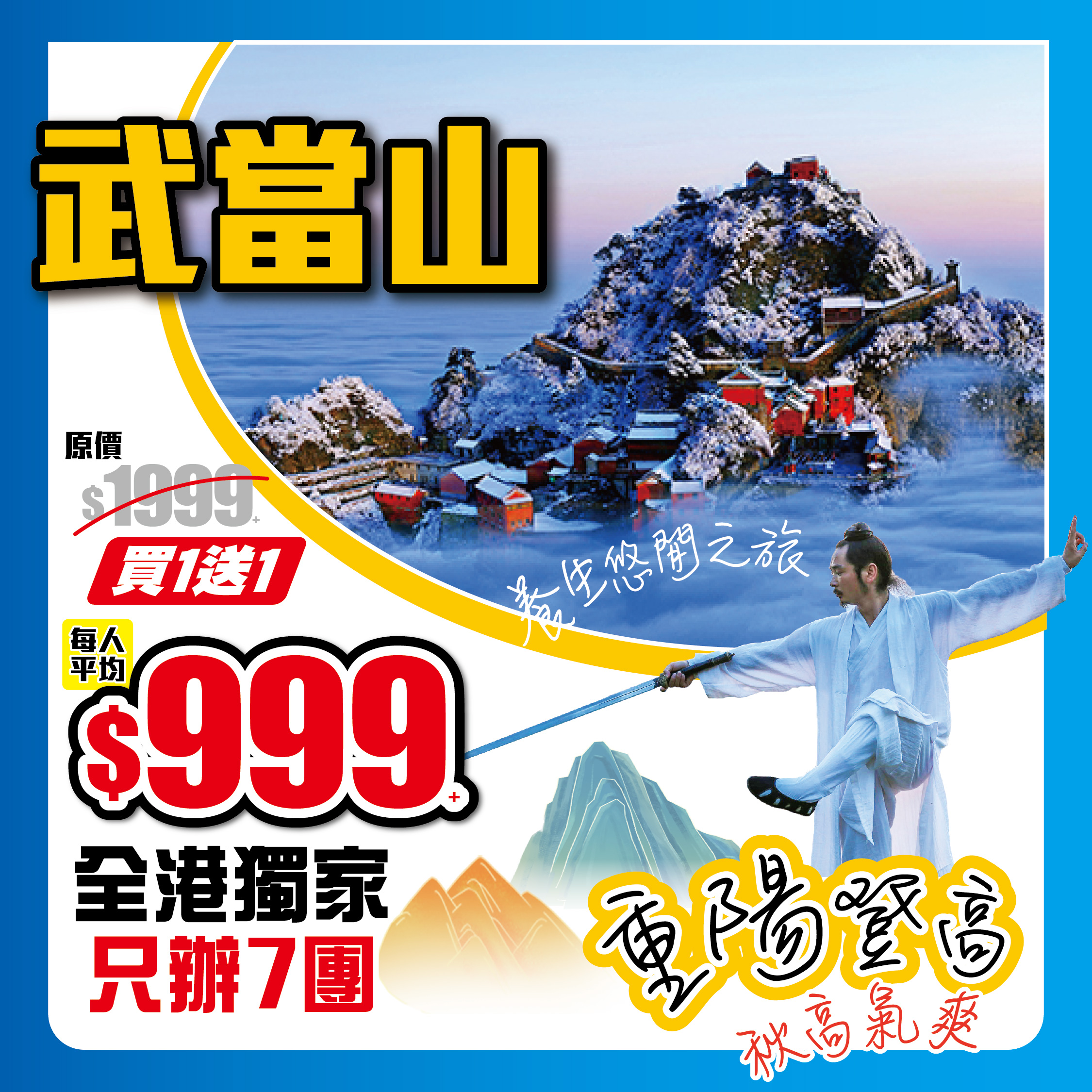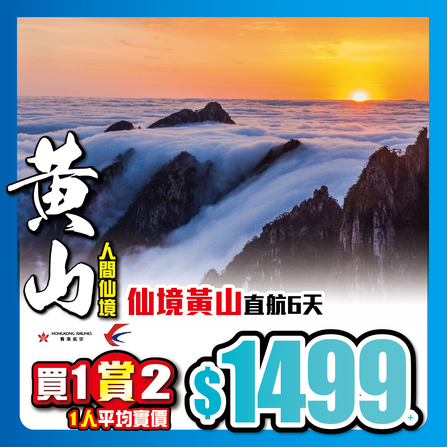 買1送1限時優惠:峨眉山包金頂、南橋藍眼淚、包船遊樂山大佛、黃龍溪古鎮、報國寺直航7天;只辦6團,4月11,21日;5月8,13,17,22日;團號:KL-SCLA07,原價:$3199+;買1送1人均價$1599+;2024-03-15