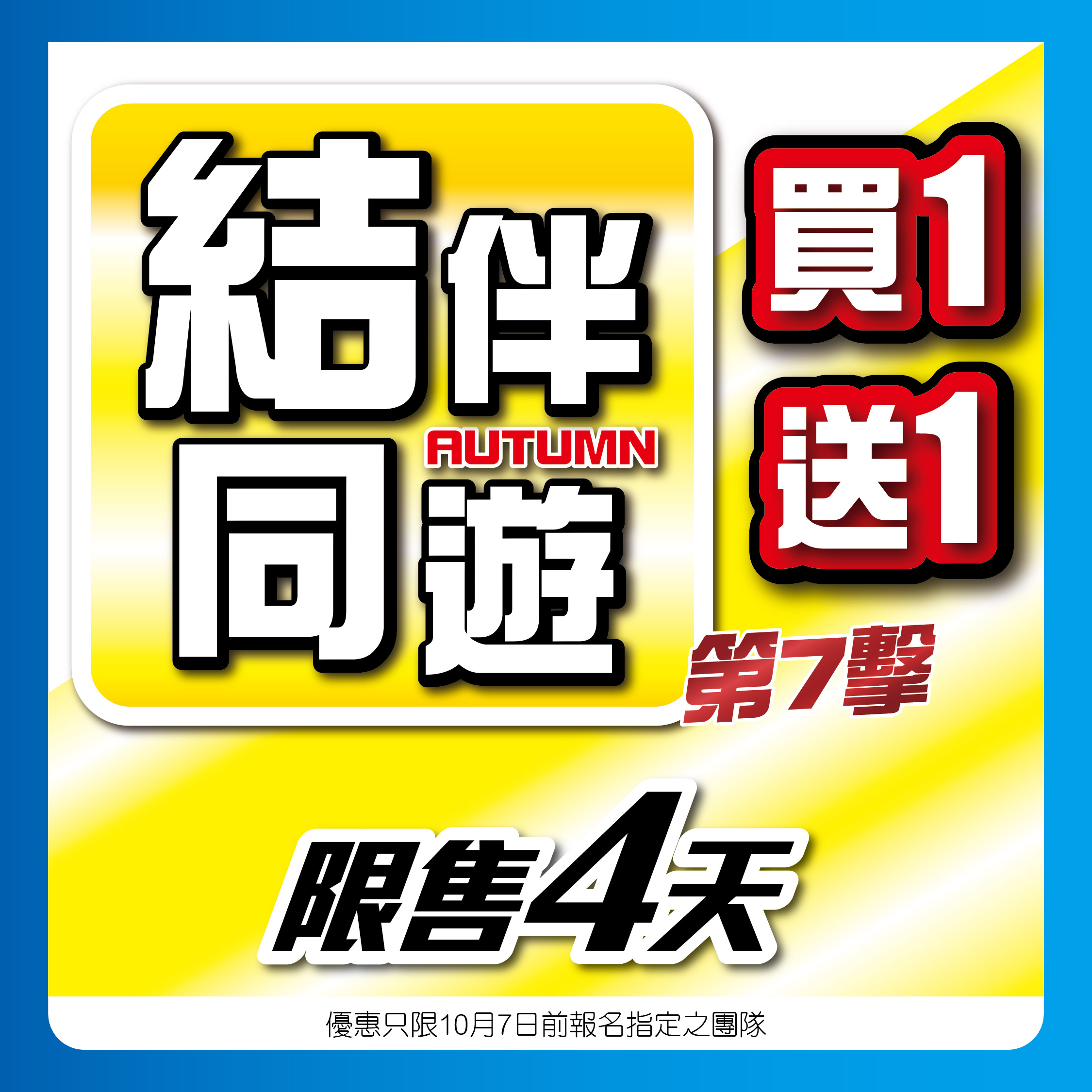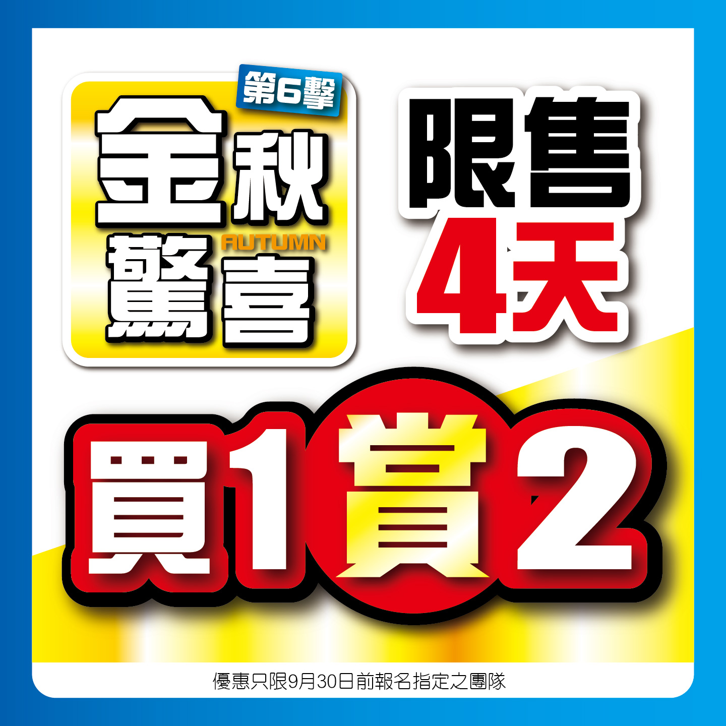 買1送1真優惠,限量名額激抵快閃,最後3天,只限指定團隊之團費計算,優惠期至3月20日止;2024-03-18