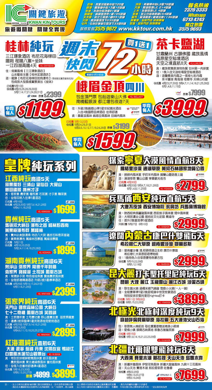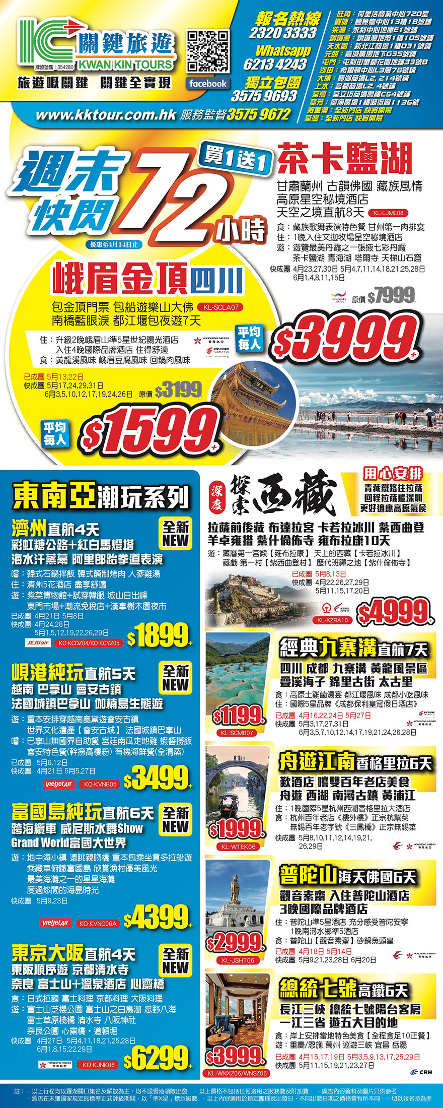 買1送1!週末快閃72小時!優惠至4月14日止!皇牌純玩系列+縱橫神州,大西北、東三省、西藏、新疆等目的地,暢遊中國大地;東南亞潮玩系列;2024-04-12