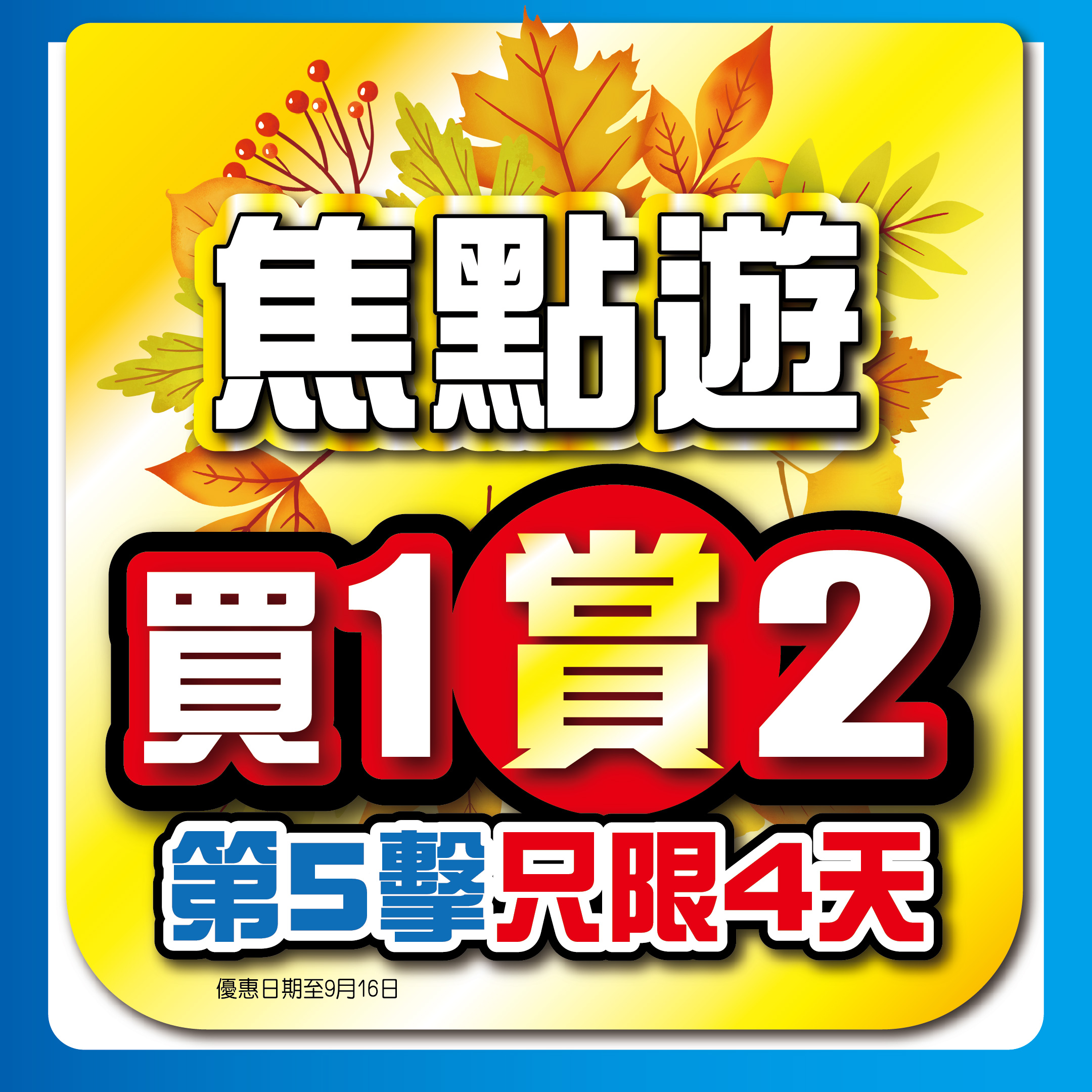 焦點遊:買1賞2第5擊,只限4天,優惠日期至9月16日