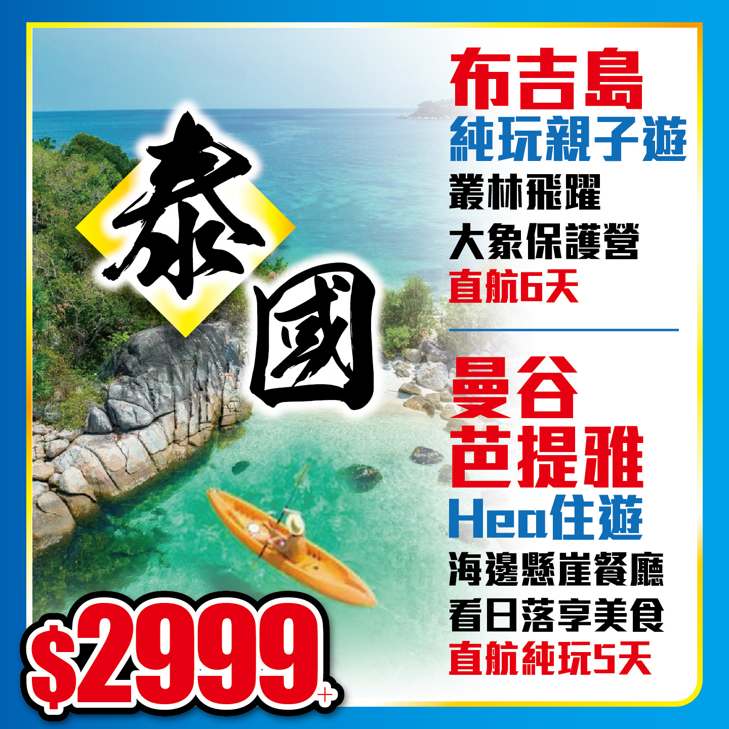 新線推介-泰國布吉島 純玩親子遊 叢林飛躍 大象保護營 直航;曼谷芭提雅Hea住遊 海邊懸崖餐廳 看日落享美食 直航!2024-05-09