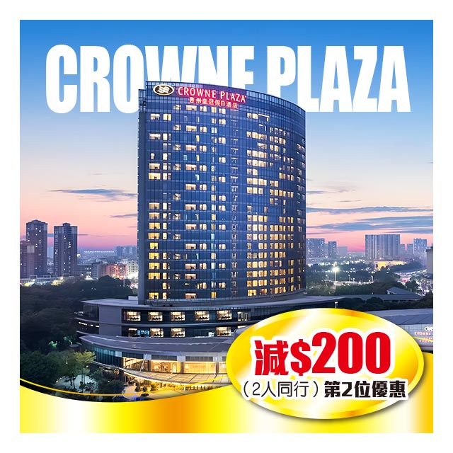 10人成團(第2位減200)頭10位升级約900呎大床套房 惠州皇冠假日酒店 酒店海鮮自助餐 純玩2天